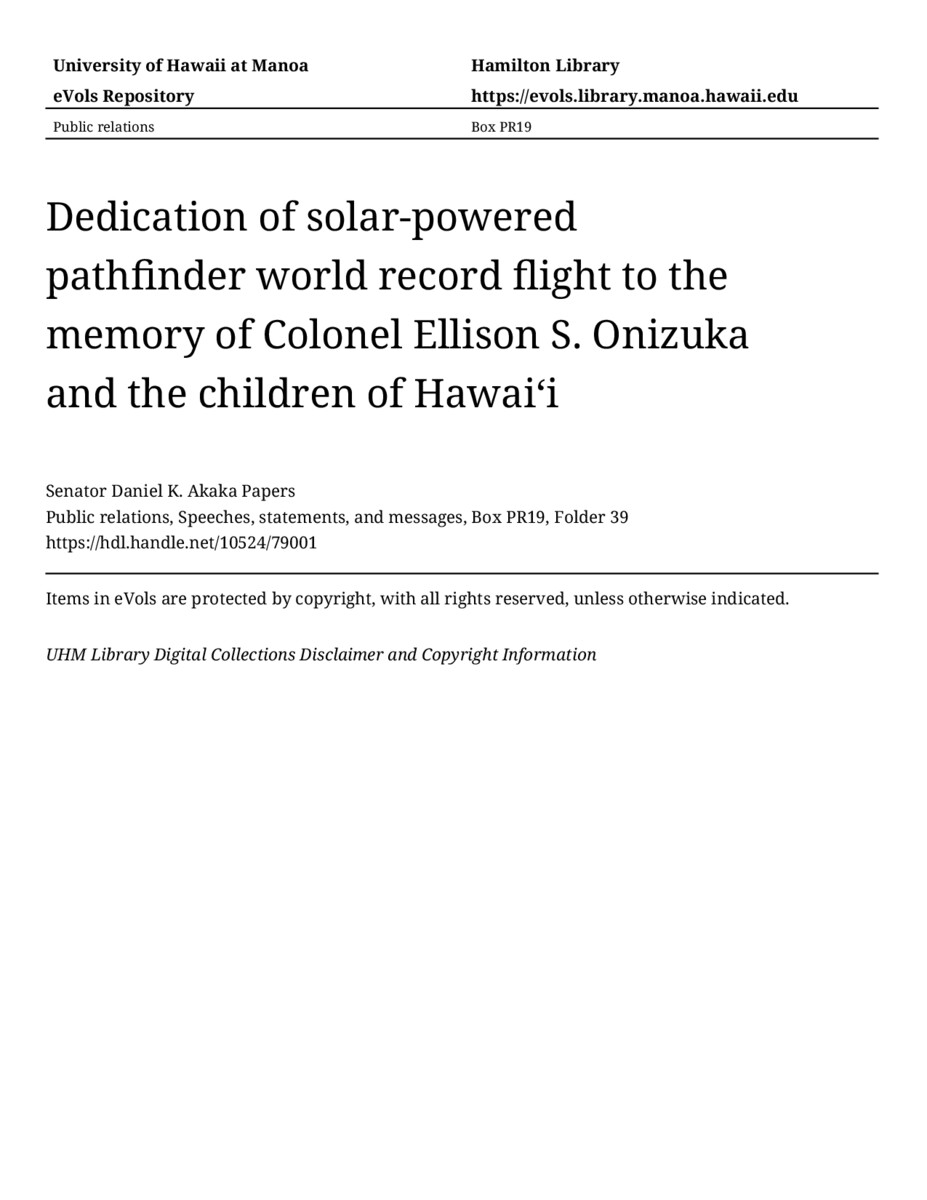 Dedication of solar-powered pathfinder world record flight to the memory of Colonel Ellison S. Onizuka and the children of Hawaiʻi, December 10, 1997, MANUSCRIPT-HCPC00010, Public relations, Speeches, statements, and messages, Box PR19, Folder 39, Senator Daniel K. Akaka Papers, Hawaiʻi Congressional Papers Collection, University of Hawaiʻi at Mānoa Library, Honolulu, HI. https://omekas-congress.lib.wvu.edu/catalog/10524_79001 (accessed April 09, 2026).