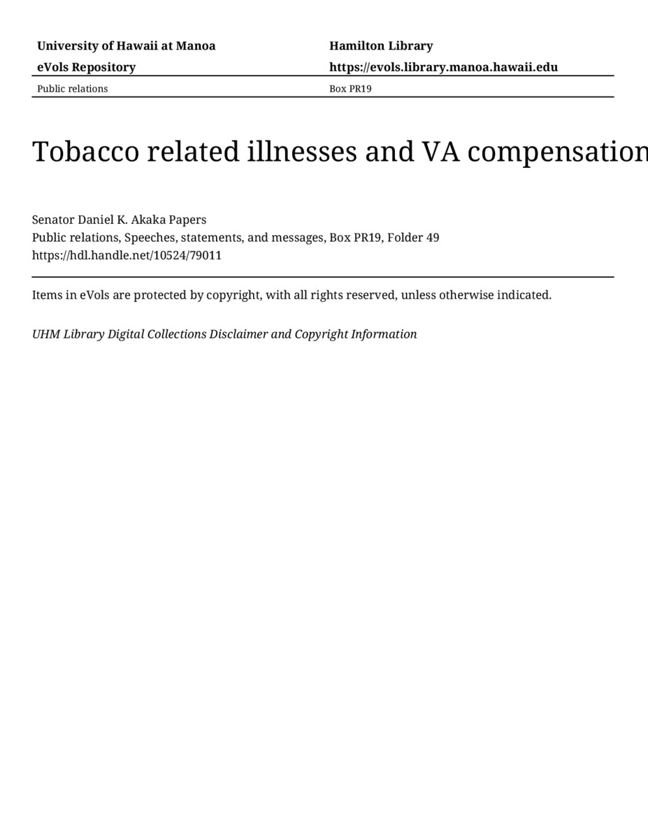 Tobacco related illnesses and VA compensation, March 31, 1998, MANUSCRIPT-HCPC00010, Public relations, Speeches, statements, and messages, Box PR19, Folder 49, Senator Daniel K. Akaka Papers, Hawaiʻi Congressional Papers Collection, University of Hawaiʻi at Mānoa Library, Honolulu, HI. https://omekas-congress.lib.wvu.edu/catalog/10524_79011 (accessed April 17, 2026).