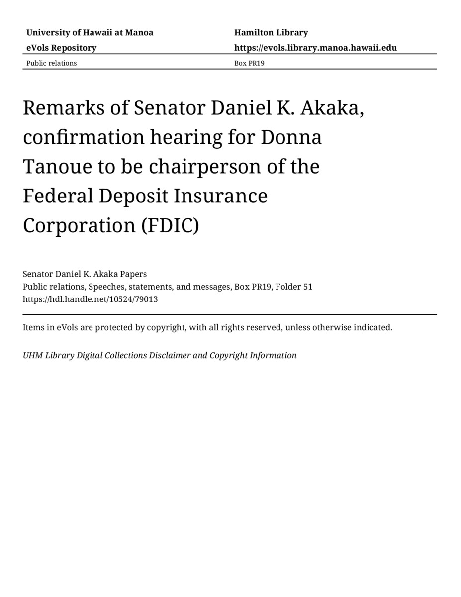 Remarks of Senator Daniel K. Akaka, confirmation hearing for Donna Tanoue to be chairperson of the Federal Deposit Insurance Corporation (FDIC), April 22, 1998, MANUSCRIPT-HCPC00010, Public relations, Speeches, statements, and messages, Box PR19, Folder 51, Senator Daniel K. Akaka Papers, Hawaiʻi Congressional Papers Collection, University of Hawaiʻi at Mānoa Library, Honolulu, HI. https://omekas-congress.lib.wvu.edu/catalog/10524_79013 (accessed April 20, 2026).