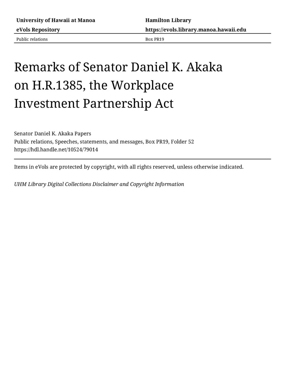 - Remarks of Senator Daniel K. Akaka on H.R.1385, the Workplace Investment Partnership Act