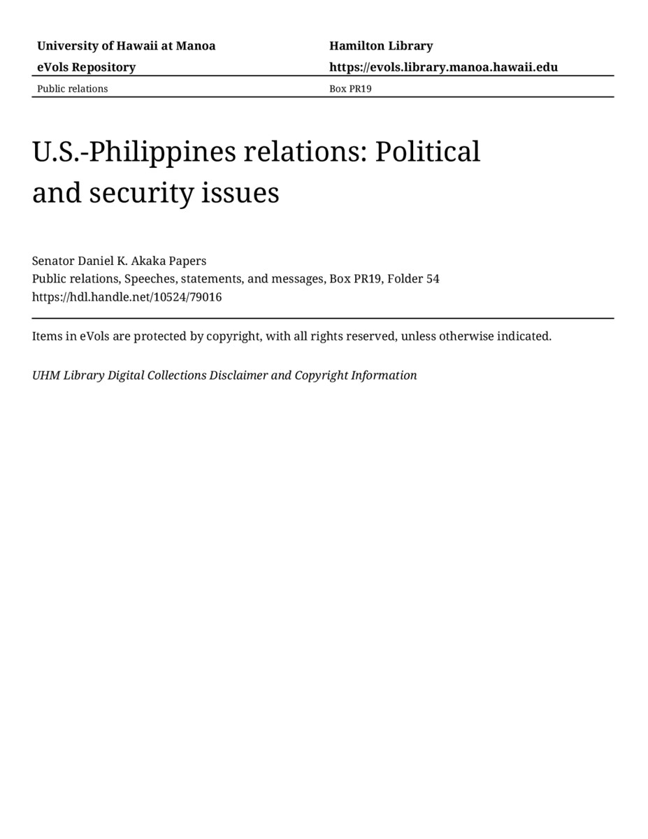 U.S.-Philippines relations: Political and security issues, May 13, 1998, MANUSCRIPT-HCPC00010, Public relations, Speeches, statements, and messages, Box PR19, Folder 54, Senator Daniel K. Akaka Papers, Hawaiʻi Congressional Papers Collection, University of Hawaiʻi at Mānoa Library, Honolulu, HI. https://omekas-congress.lib.wvu.edu/catalog/10524_79016 (accessed April 17, 2026).