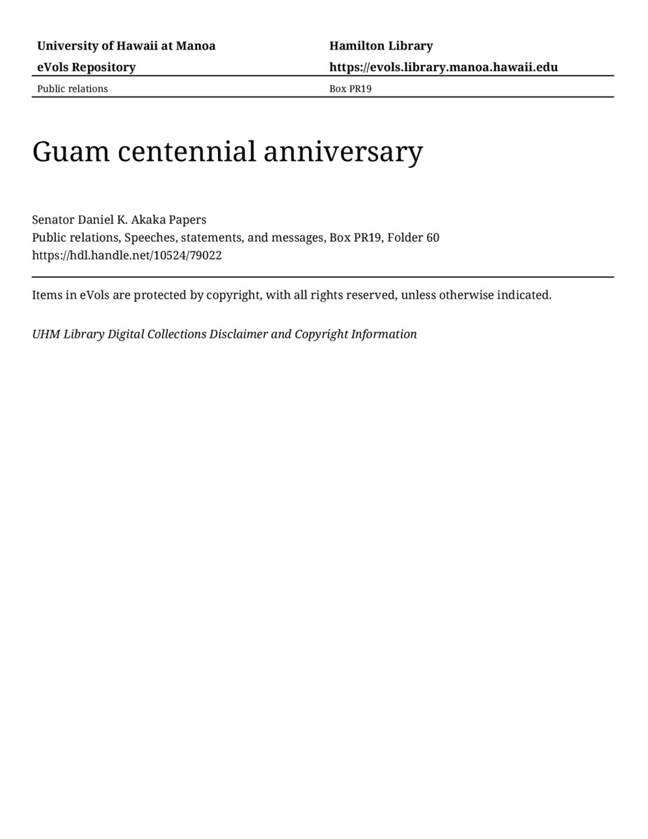 Guam centennial anniversary, June 24, 1998, MANUSCRIPT-HCPC00010, Public relations, Speeches, statements, and messages, Box PR19, Folder 60, Senator Daniel K. Akaka Papers, Hawaiʻi Congressional Papers Collection, University of Hawaiʻi at Mānoa Library, Honolulu, HI. https://omekas-congress.lib.wvu.edu/catalog/10524_79022 (accessed April 20, 2026).