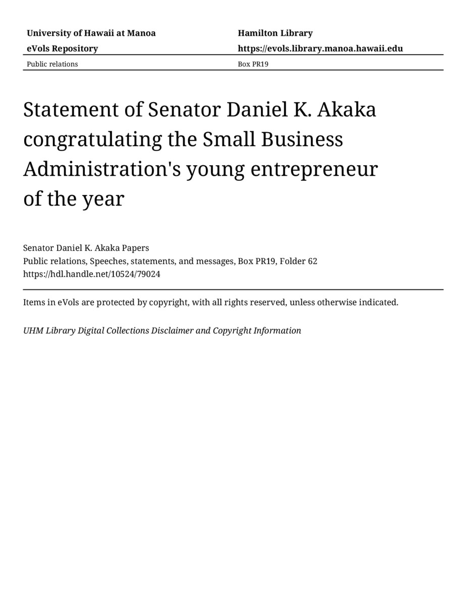 Statement of Senator Daniel K. Akaka congratulating the Small Business Administration's young entrepreneur of the year, July 14, 1998, MANUSCRIPT-HCPC00010, Public relations, Speeches, statements, and messages, Box PR19, Folder 62, Senator Daniel K. Akaka Papers, Hawaiʻi Congressional Papers Collection, University of Hawaiʻi at Mānoa Library, Honolulu, HI. https://omekas-congress.lib.wvu.edu/catalog/10524_79024 (accessed April 12, 2026).
