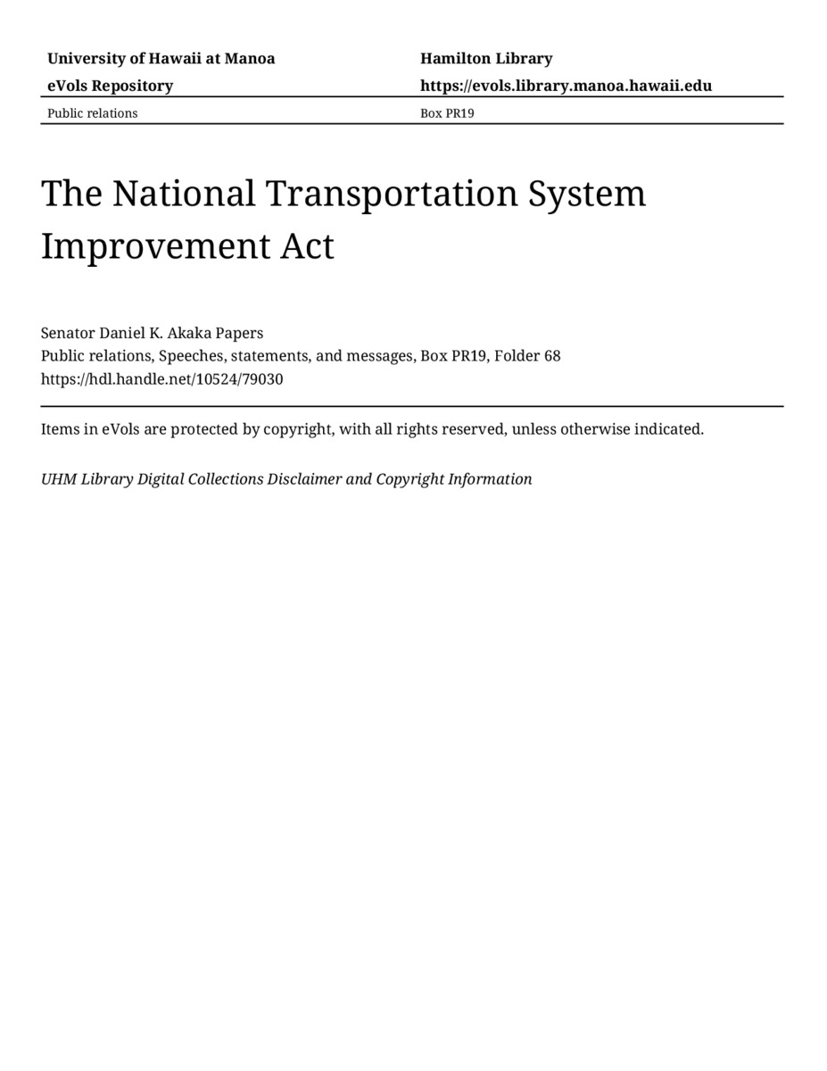 The National Transportation System Improvement Act, September 23, 1998, MANUSCRIPT-HCPC00010, Public relations, Speeches, statements, and messages, Box PR19, Folder 68, Senator Daniel K. Akaka Papers, Hawaiʻi Congressional Papers Collection, University of Hawaiʻi at Mānoa Library, Honolulu, HI. https://omekas-congress.lib.wvu.edu/catalog/10524_79030 (accessed April 17, 2026).