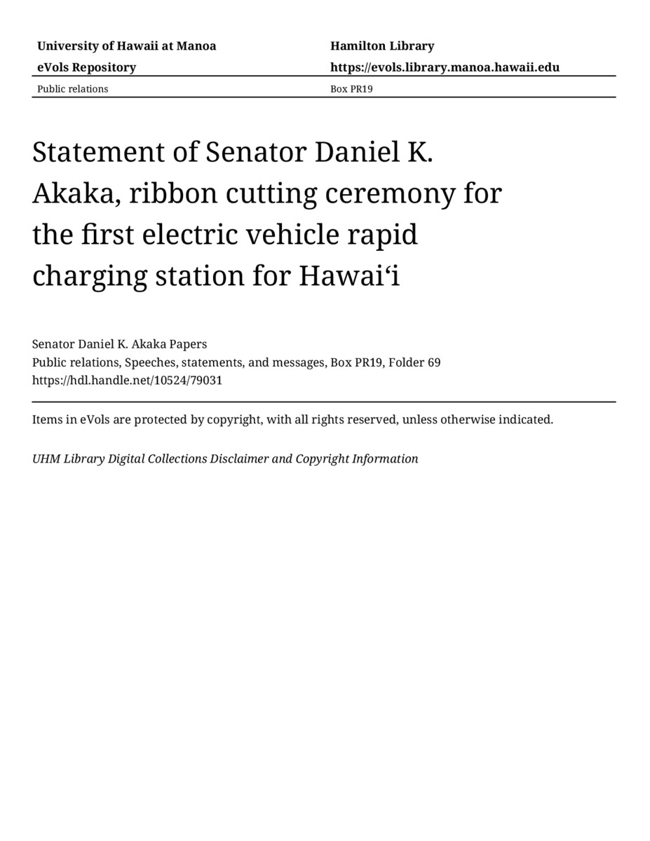 Statement of Senator Daniel K. Akaka, ribbon cutting ceremony for the first electric vehicle rapid charging station for Hawaiʻi, October 27, 1998, MANUSCRIPT-HCPC00010, Public relations, Speeches, statements, and messages, Box PR19, Folder 69, Senator Daniel K. Akaka Papers, Hawaiʻi Congressional Papers Collection, University of Hawaiʻi at Mānoa Library, Honolulu, HI. https://omekas-congress.lib.wvu.edu/catalog/10524_79031 (accessed April 18, 2026).