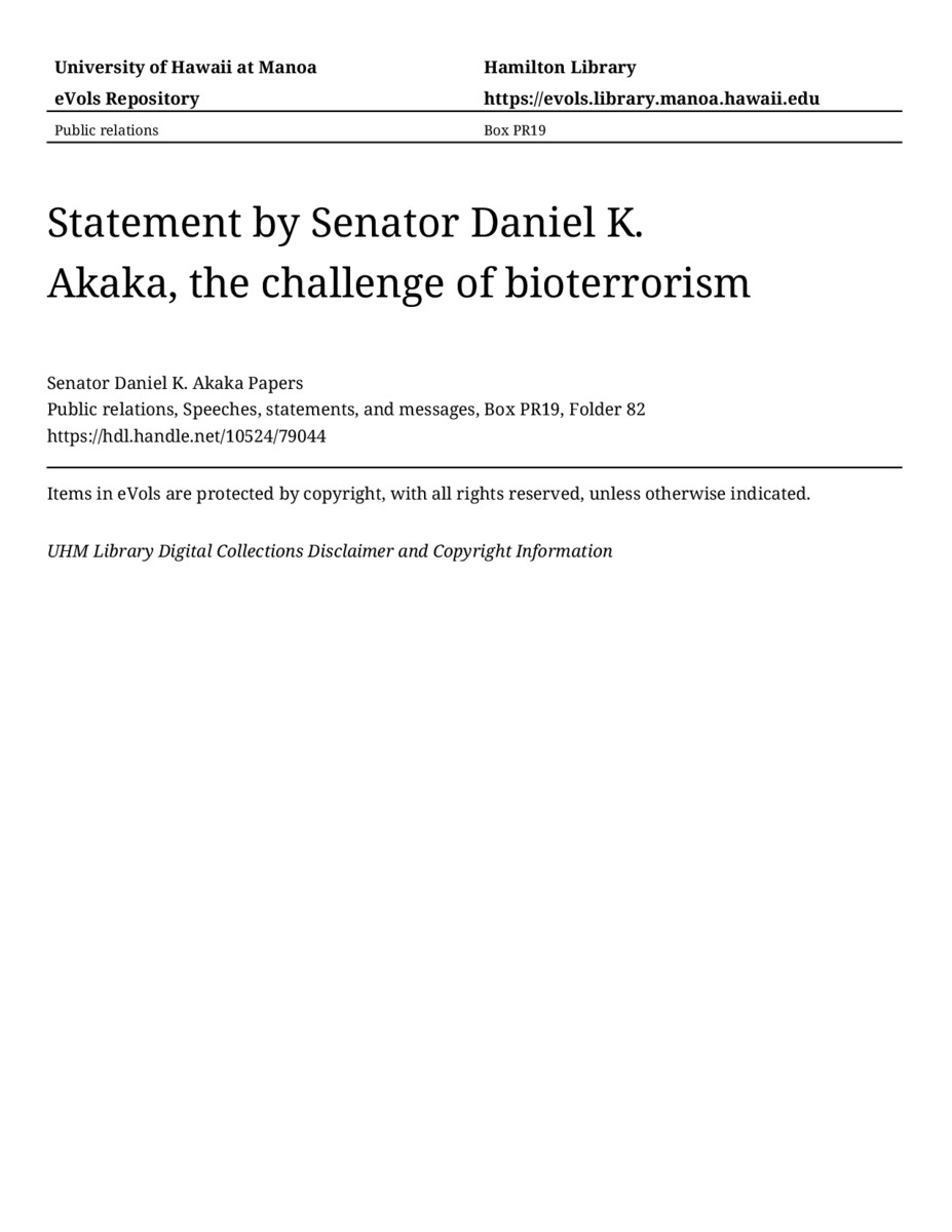 - Statement by Senator Daniel K. Akaka, the challenge of bioterrorism