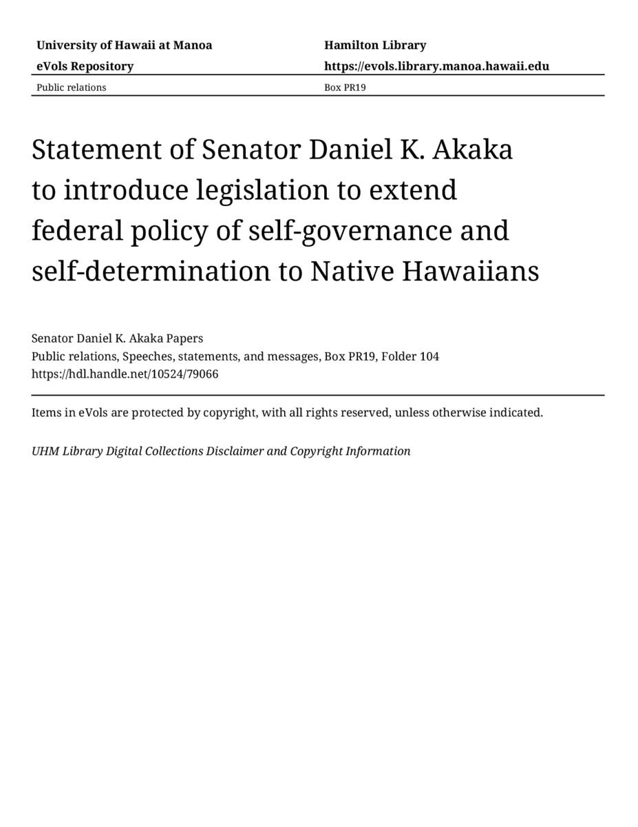 Statement of Senator Daniel K. Akaka to introduce legislation to extend federal policy of self-governance and self-determination to Native Hawaiians, February 6, 2003, MANUSCRIPT-HCPC00010, Public relations, Speeches, statements, and messages, Box PR19, Folder 104, Senator Daniel K. Akaka Papers, Hawaiʻi Congressional Papers Collection, University of Hawaiʻi at Mānoa Library, Honolulu, HI. https://omekas-congress.lib.wvu.edu/catalog/10524_79066 (accessed April 11, 2026).