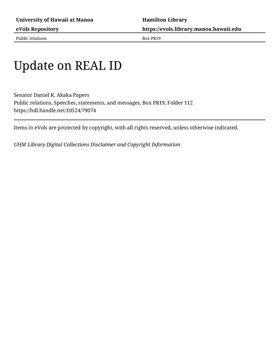 Update on REAL ID, May 10, 2007, MANUSCRIPT-HCPC00010, Public relations, Speeches, statements, and messages, Box PR19, Folder 112, Senator Daniel K. Akaka Papers, Hawaiʻi Congressional Papers Collection, University of Hawaiʻi at Mānoa Library, Honolulu, HI. https://omekas-congress.lib.wvu.edu/catalog/10524_79074 (accessed April 17, 2026).