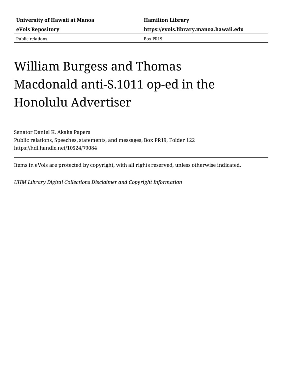 - William Burgess and Thomas Macdonald anti-S.1011 op-ed in the Honolulu Advertiser