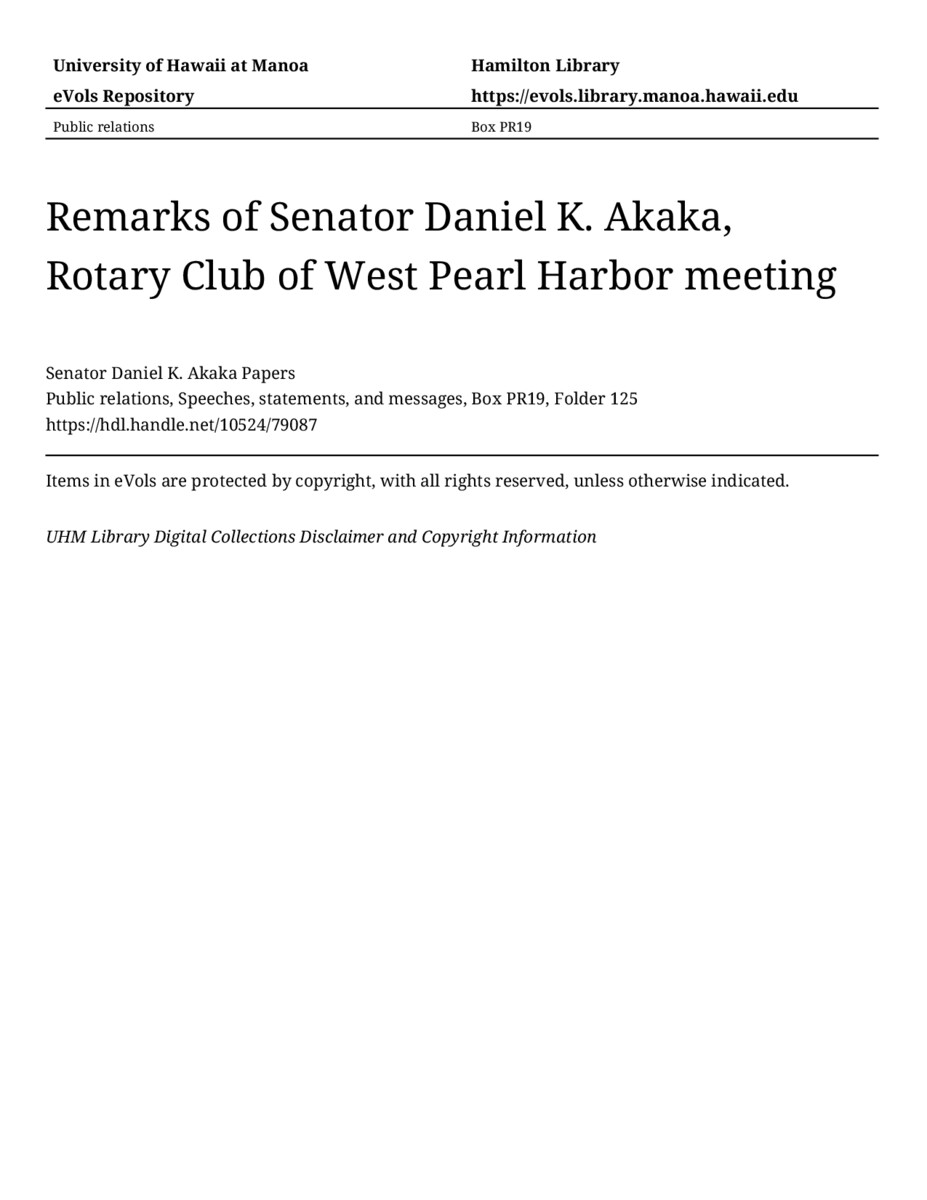 - Remarks of Senator Daniel K. Akaka, Rotary Club of West Pearl Harbor meeting