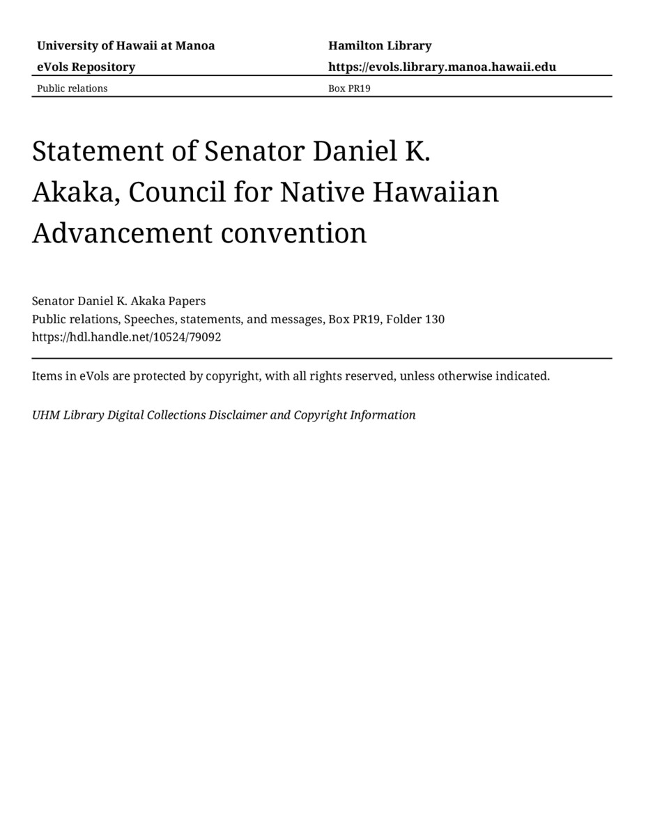 - Statement of Senator Daniel K. Akaka, Council for Native Hawaiian Advancement convention