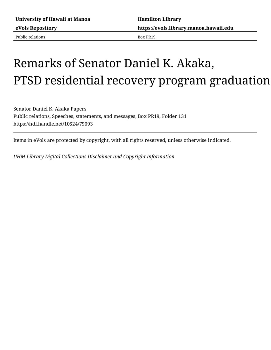 - Remarks of Senator Daniel K. Akaka, PTSD residential recovery program graduation
