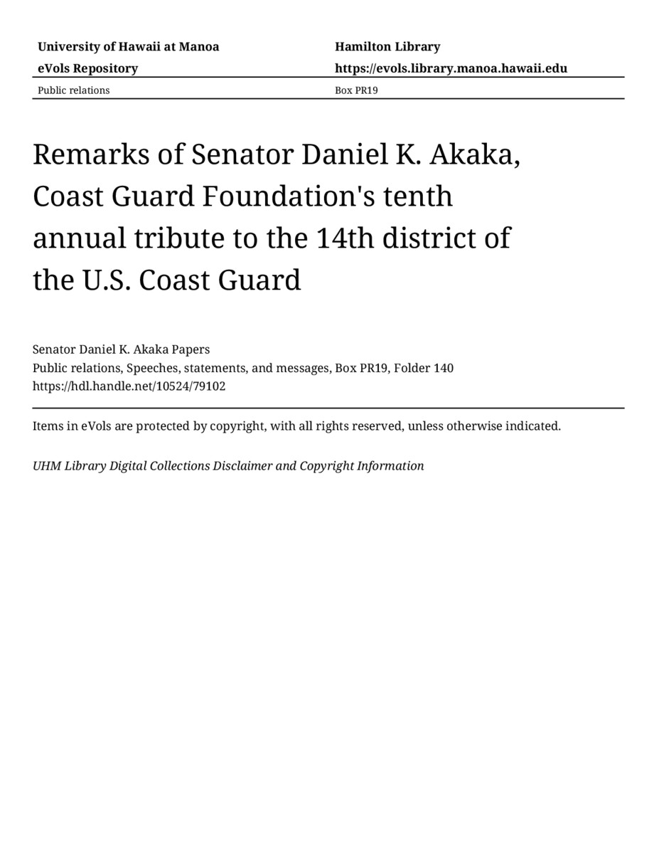 Remarks of Senator Daniel K. Akaka, Coast Guard Foundation's tenth annual tribute to the 14th district of the U.S. Coast Guard, April 6, 2012, MANUSCRIPT-HCPC00010, Public relations, Speeches, statements, and messages, Box PR19, Folder 140, Senator Daniel K. Akaka Papers, Hawaiʻi Congressional Papers Collection, University of Hawaiʻi at Mānoa Library, Honolulu, HI. https://omekas-congress.lib.wvu.edu/catalog/10524_79102 (accessed April 10, 2026).