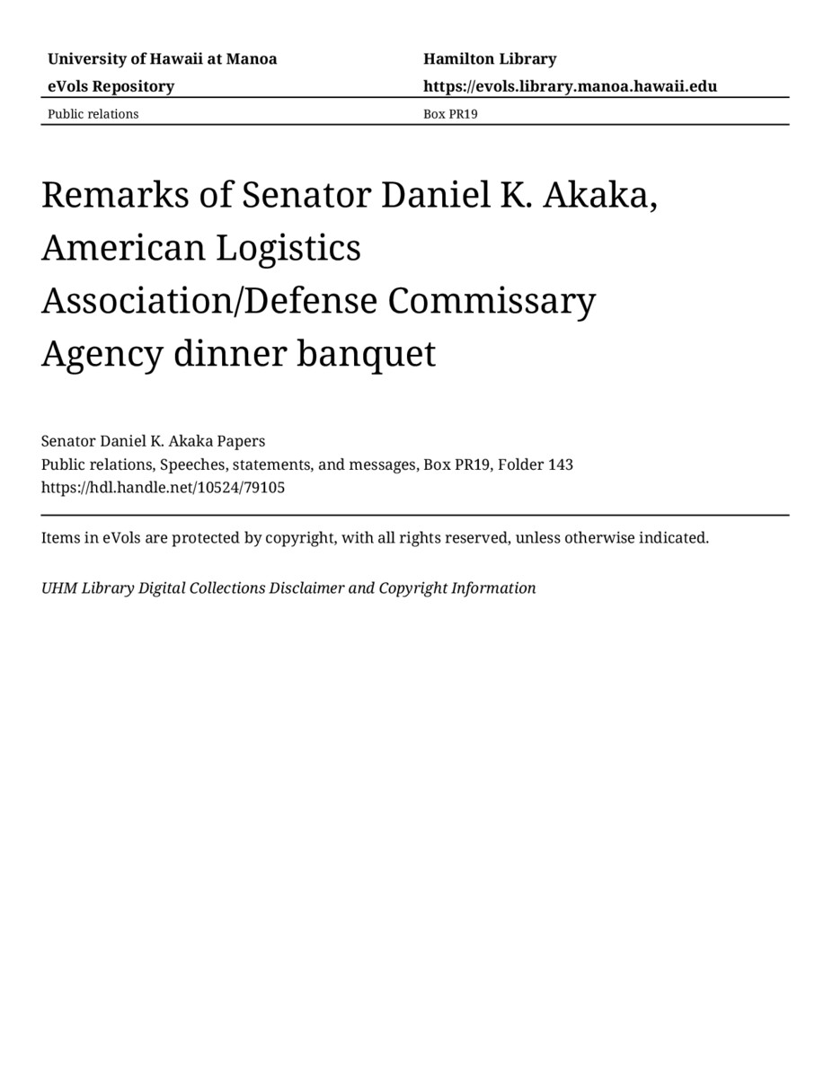 Remarks of Senator Daniel K. Akaka, American Logistics Association/Defense Commissary Agency dinner banquet, August 23, 2012, MANUSCRIPT-HCPC00010, Public relations, Speeches, statements, and messages, Box PR19, Folder 143, Senator Daniel K. Akaka Papers, Hawaiʻi Congressional Papers Collection, University of Hawaiʻi at Mānoa Library, Honolulu, HI. https://omekas-congress.lib.wvu.edu/catalog/10524_79105 (accessed April 10, 2026).