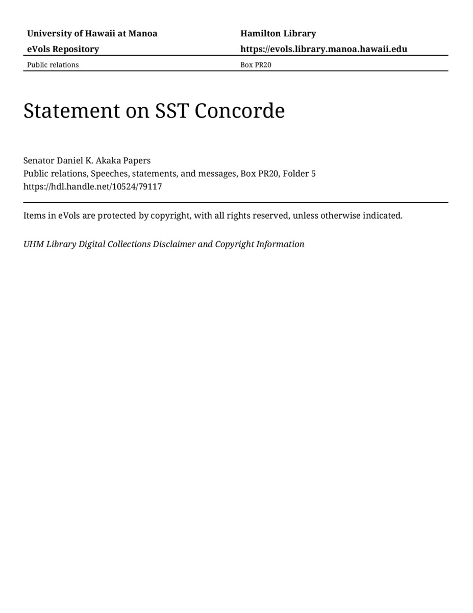 Statement on SST Concorde, approximately 1977, MANUSCRIPT-HCPC00010, Public relations, Speeches, statements, and messages, Box PR20, Folder 5, Senator Daniel K. Akaka Papers, Hawaiʻi Congressional Papers Collection, University of Hawaiʻi at Mānoa Library, Honolulu, HI. https://omekas-congress.lib.wvu.edu/catalog/10524_79117 (accessed April 12, 2026).