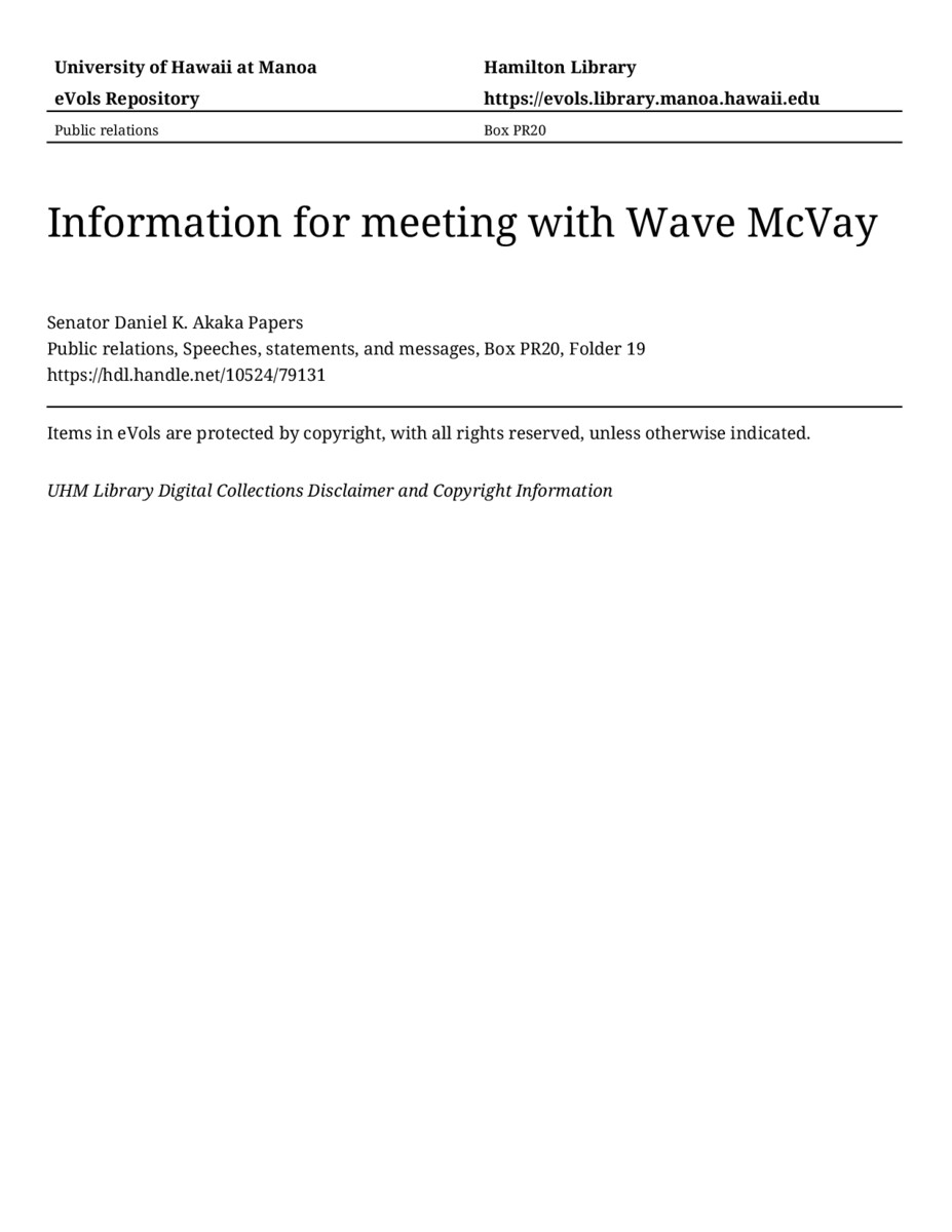Information for meeting with Wave McVay, August 31, 1984, MANUSCRIPT-HCPC00010, Public relations, Speeches, statements, and messages, Box PR20, Folder 19, Senator Daniel K. Akaka Papers, Hawaiʻi Congressional Papers Collection, University of Hawaiʻi at Mānoa Library, Honolulu, HI. https://omekas-congress.lib.wvu.edu/catalog/10524_79131 (accessed April 17, 2026).