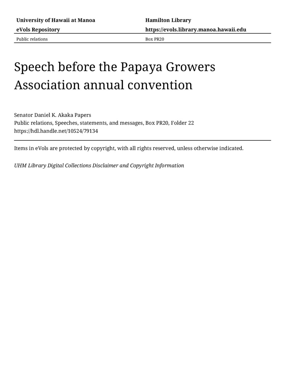 Speech before the Papaya Growers Association annual convention, September 28, 1984, MANUSCRIPT-HCPC00010, Public relations, Speeches, statements, and messages, Box PR20, Folder 22, Senator Daniel K. Akaka Papers, Hawaiʻi Congressional Papers Collection, University of Hawaiʻi at Mānoa Library, Honolulu, HI. https://omekas-congress.lib.wvu.edu/catalog/10524_79134 (accessed April 20, 2026).