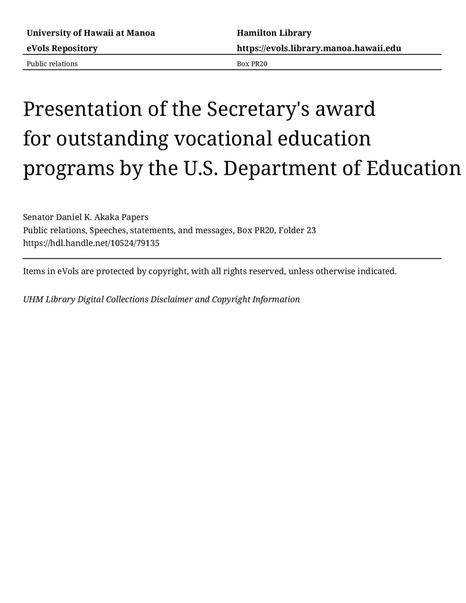 Presentation of the Secretary's award for outstanding vocational education programs by the U.S. Department of Education, October 20, 1984, MANUSCRIPT-HCPC00010, Public relations, Speeches, statements, and messages, Box PR20, Folder 23, Senator Daniel K. Akaka Papers, Hawaiʻi Congressional Papers Collection, University of Hawaiʻi at Mānoa Library, Honolulu, HI. https://omekas-congress.lib.wvu.edu/catalog/10524_79135 (accessed April 17, 2026).