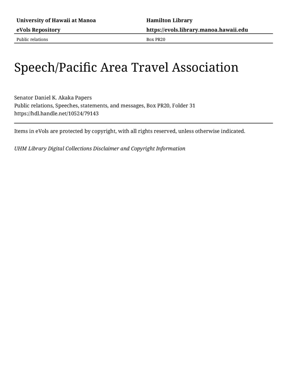 Speech/Pacific Area Travel Association, November 29, 1984, MANUSCRIPT-HCPC00010, Public relations, Speeches, statements, and messages, Box PR20, Folder 31, Senator Daniel K. Akaka Papers, Hawaiʻi Congressional Papers Collection, University of Hawaiʻi at Mānoa Library, Honolulu, HI. https://omekas-congress.lib.wvu.edu/catalog/10524_79143 (accessed April 19, 2026).