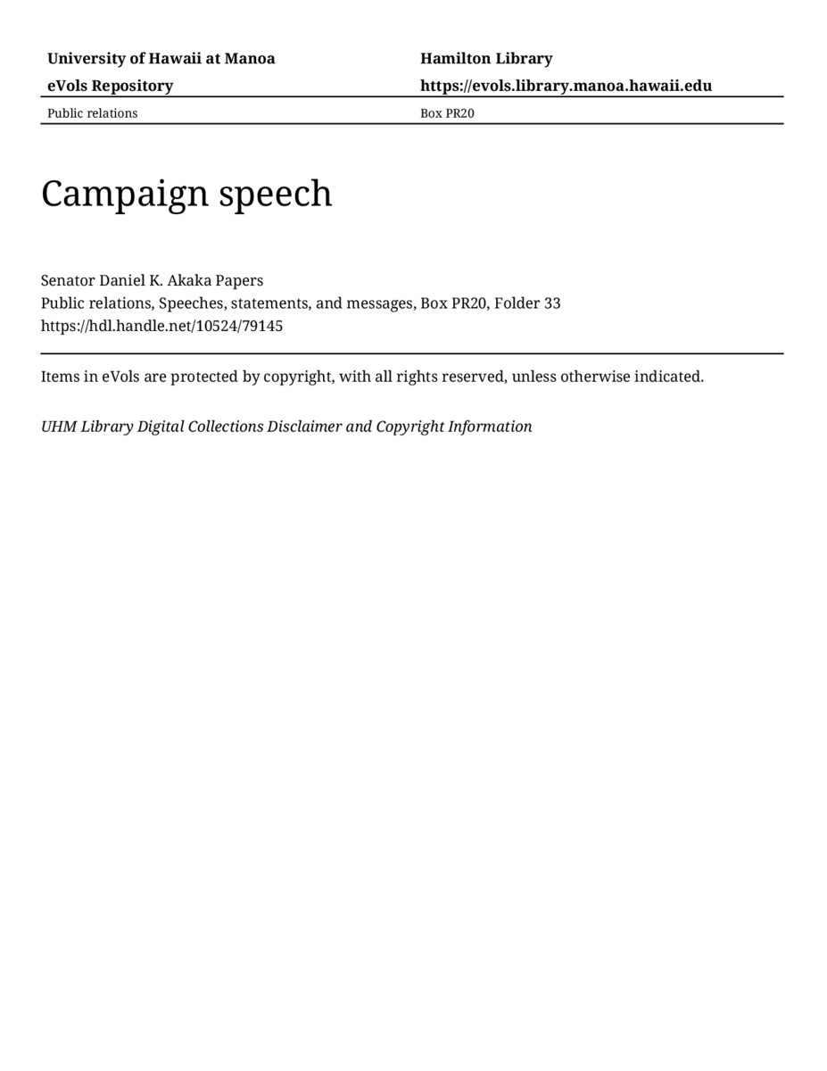 Campaign speech, June 6, 1905, MANUSCRIPT-HCPC00010, Public relations, Speeches, statements, and messages, Box PR20, Folder 33, Senator Daniel K. Akaka Papers, Hawaiʻi Congressional Papers Collection, University of Hawaiʻi at Mānoa Library, Honolulu, HI. https://omekas-congress.lib.wvu.edu/catalog/10524_79145 (accessed April 18, 2026).