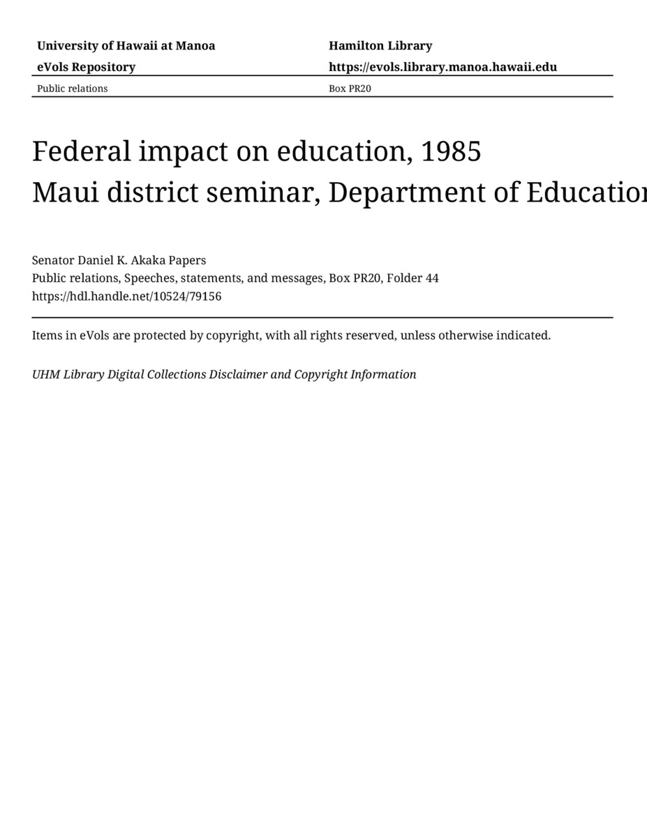 - Federal impact on education, 1985 Maui district seminar, Department of Education