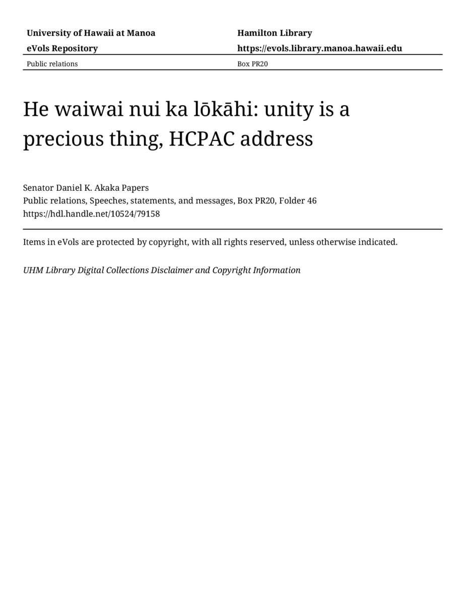 He waiwai nui ka lōkāhi: unity is a precious thing, HCPAC address