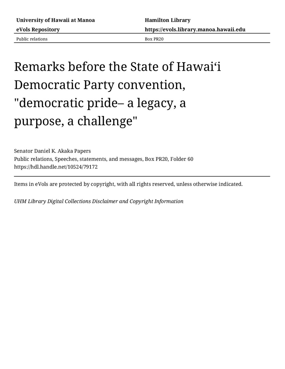 Remarks before the State of Hawaiʻi Democratic Party convention, "democratic pride– a legacy, a purpose, a challenge", May 23, 1986, MANUSCRIPT-HCPC00010, Public relations, Speeches, statements, and messages, Box PR20, Folder 60, Senator Daniel K. Akaka Papers, Hawaiʻi Congressional Papers Collection, University of Hawaiʻi at Mānoa Library, Honolulu, HI. https://omekas-congress.lib.wvu.edu/catalog/10524_79172 (accessed April 20, 2026).