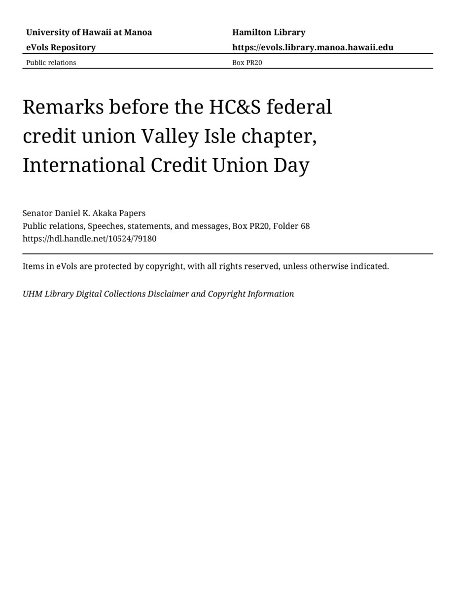 - Remarks before the HC&S federal credit union Valley Isle chapter, International Credit Union Day