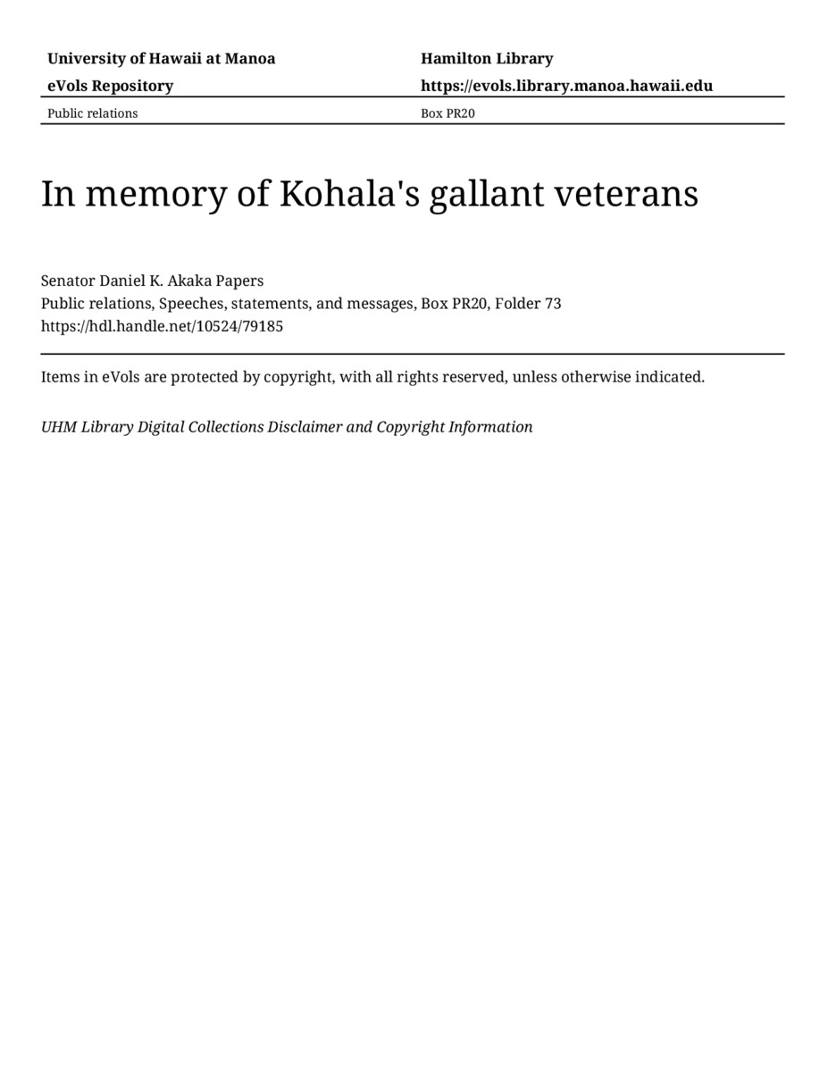 In memory of Kohala's gallant veterans, approximately 1986, MANUSCRIPT-HCPC00010, Public relations, Speeches, statements, and messages, Box PR20, Folder 73, Senator Daniel K. Akaka Papers, Hawaiʻi Congressional Papers Collection, University of Hawaiʻi at Mānoa Library, Honolulu, HI. https://omekas-congress.lib.wvu.edu/catalog/10524_79185 (accessed April 20, 2026).
