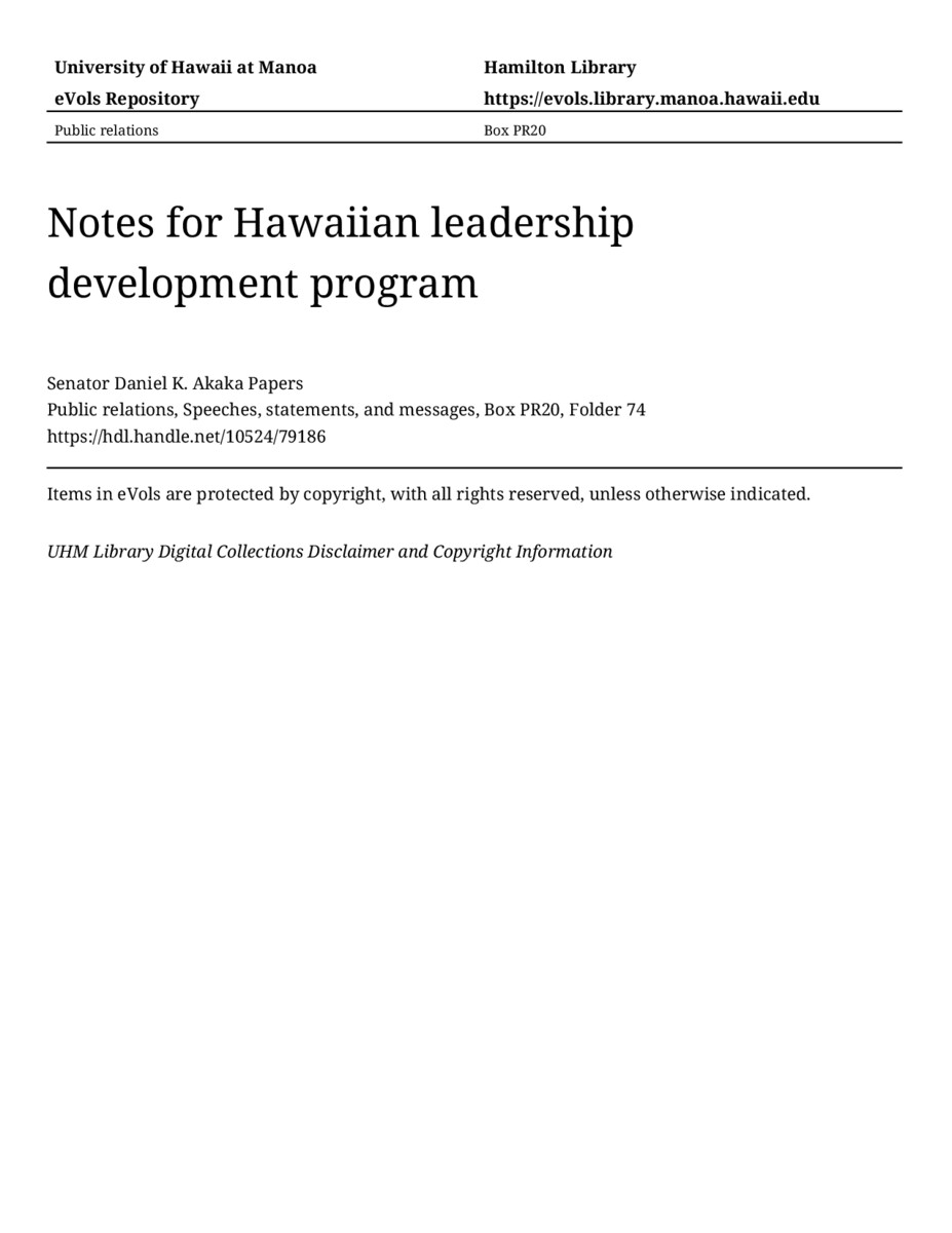 Notes for Hawaiian leadership development program, April 6, 1987, MANUSCRIPT-HCPC00010, Public relations, Speeches, statements, and messages, Box PR20, Folder 74, Senator Daniel K. Akaka Papers, Hawaiʻi Congressional Papers Collection, University of Hawaiʻi at Mānoa Library, Honolulu, HI. https://omekas-congress.lib.wvu.edu/catalog/10524_79186 (accessed April 20, 2026).