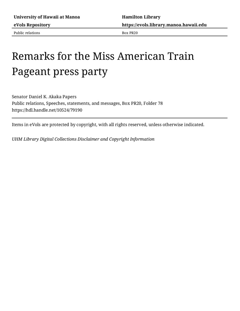 Remarks for the Miss American Train Pageant press party, June 10, 1988, MANUSCRIPT-HCPC00010, Public relations, Speeches, statements, and messages, Box PR20, Folder 78, Senator Daniel K. Akaka Papers, Hawaiʻi Congressional Papers Collection, University of Hawaiʻi at Mānoa Library, Honolulu, HI. https://omekas-congress.lib.wvu.edu/catalog/10524_79190 (accessed April 18, 2026).
