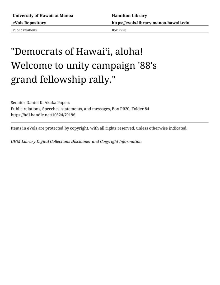 - "Democrats of Hawaiʻi, aloha! Welcome to unity campaign '88's grand fellowship rally."