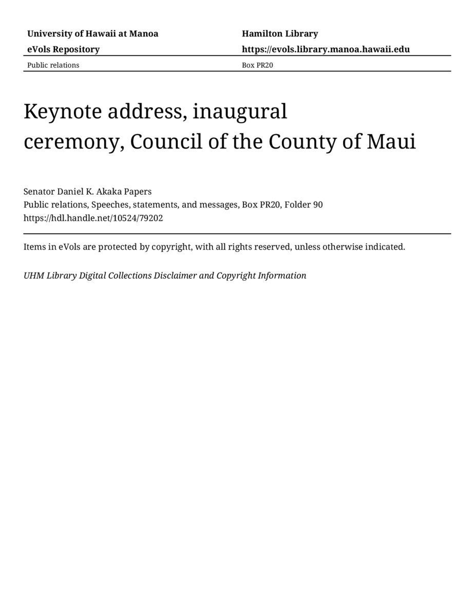 - Keynote address, inaugural ceremony, Council of the County of Maui