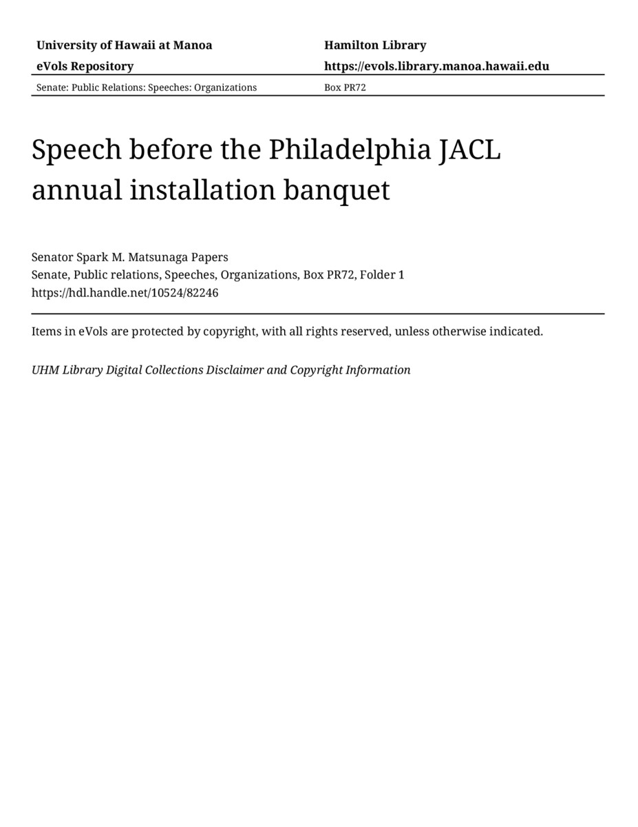 - Speech before the Philadelphia JACL annual installation banquet