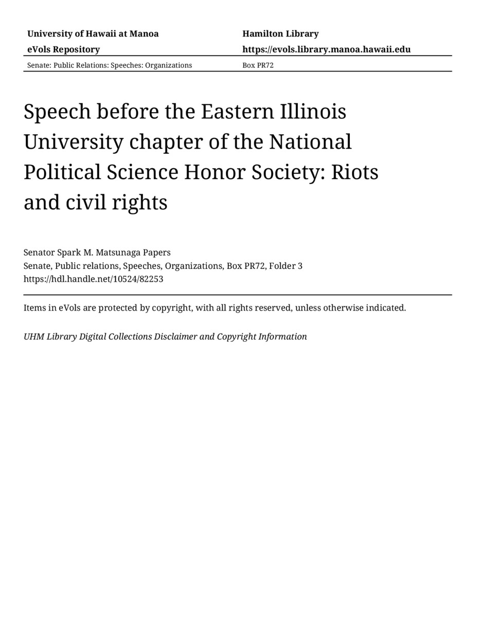 Speech before the Eastern Illinois University chapter of the National Political Science Honor Society: Riots and civil rights