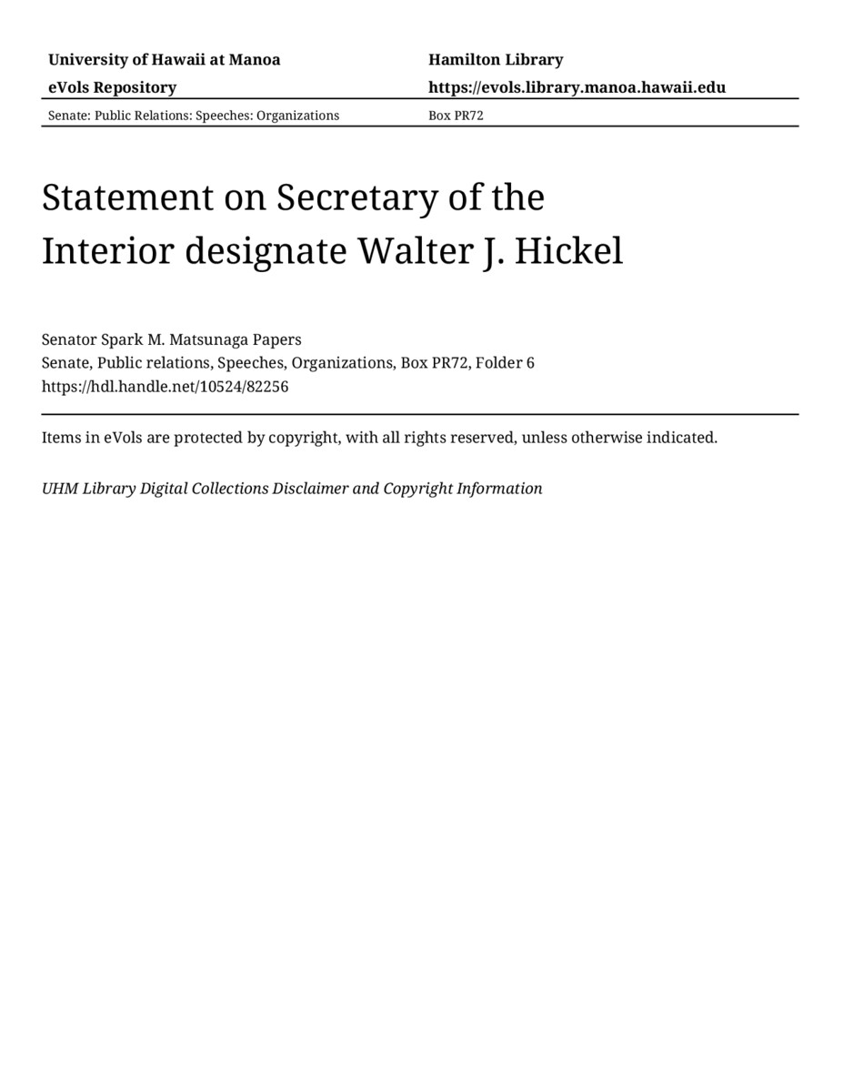 - Statement on Secretary of the Interior designate Walter J. Hickel
