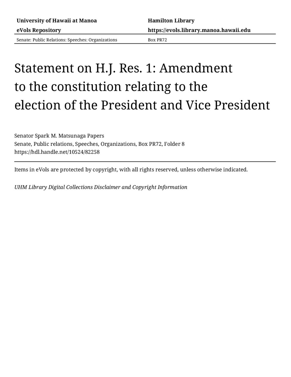 - Statement on H.J. Res. 1: Amendment to the constitution relating to the election of the President and Vice President