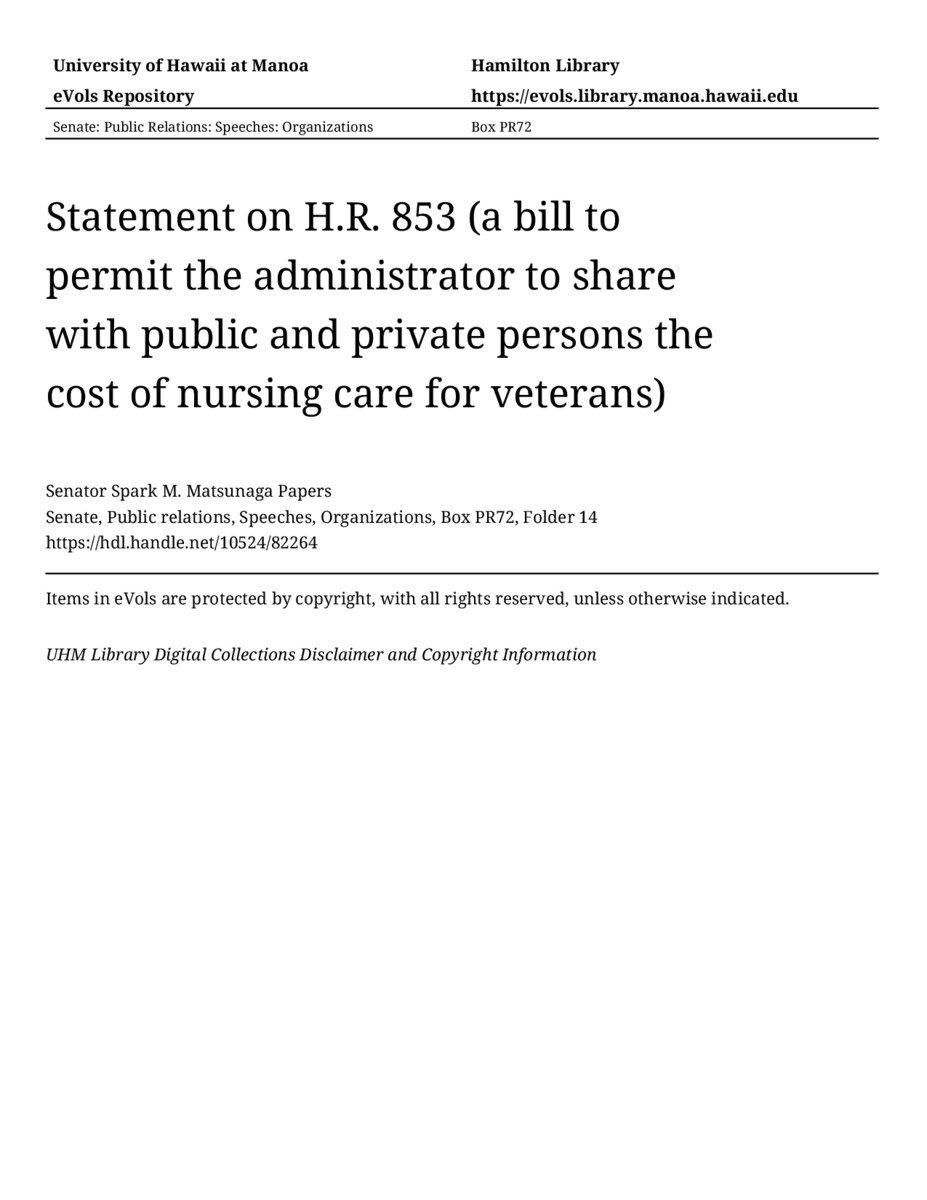 Statement on H.R. 853 (a bill to permit the administrator to share with public and private persons the cost of nursing care for veterans), 05/13/69, Senate, Public relations, Speeches, Organizations, Box PR72, Folder 14, Senator Spark M. Matsunaga Papers, Hawaiʻi Congressional Papers Collection, University of Hawaiʻi at Mānoa Library, Honolulu, HI. https://omekas-congress.lib.wvu.edu/catalog/10524_82264 (accessed April 11, 2026).