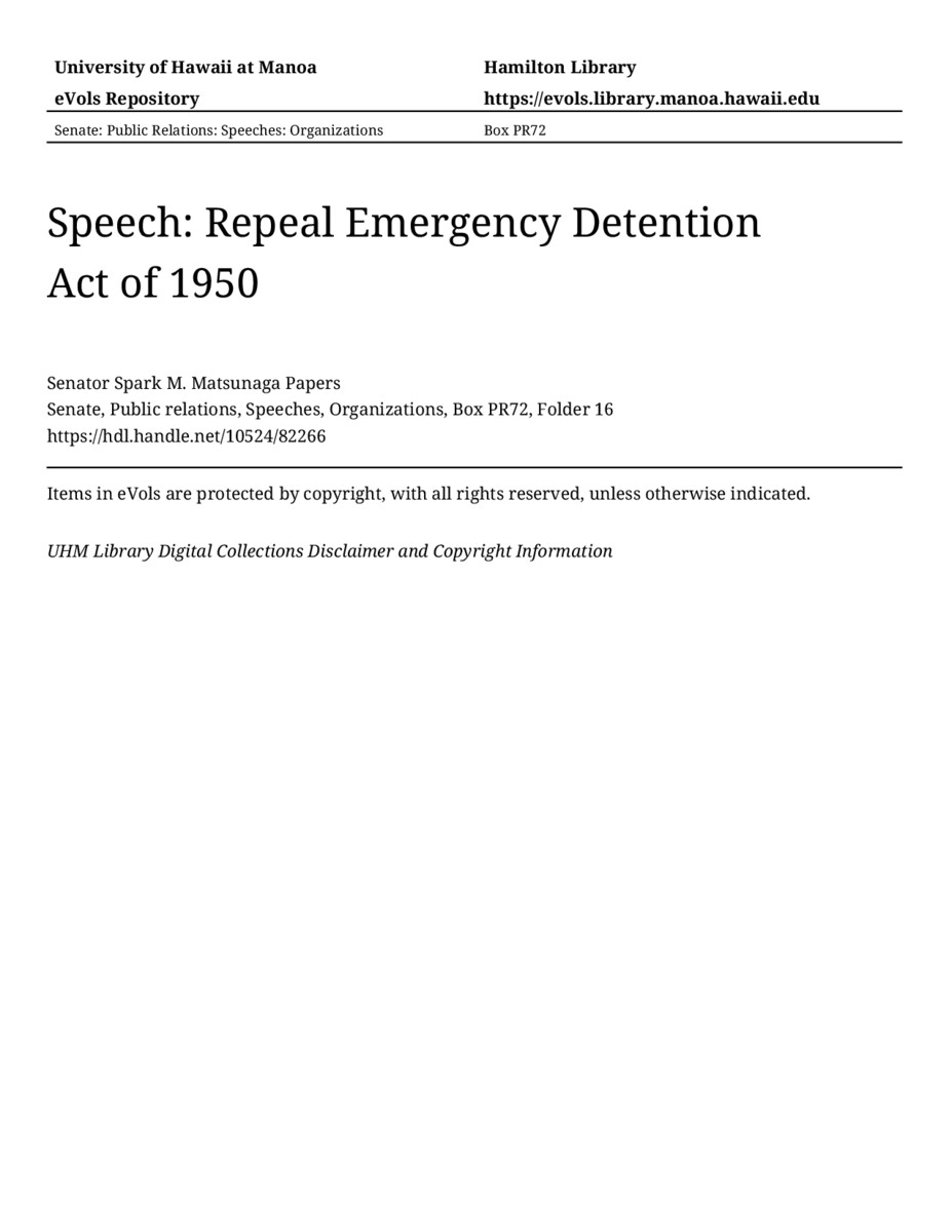 Speech: Repeal Emergency Detention Act of 1950, 06/03/69, Senate, Public relations, Speeches, Organizations, Box PR72, Folder 16, Senator Spark M. Matsunaga Papers, Hawaiʻi Congressional Papers Collection, University of Hawaiʻi at Mānoa Library, Honolulu, HI. https://omekas-congress.lib.wvu.edu/catalog/10524_82266 (accessed April 11, 2026).