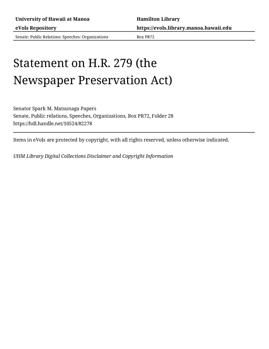 Statement on H.R. 279 (the Newspaper Preservation Act), 09/10/69, Senate, Public relations, Speeches, Organizations, Box PR72, Folder 28, Senator Spark M. Matsunaga Papers, Hawaiʻi Congressional Papers Collection, University of Hawaiʻi at Mānoa Library, Honolulu, HI. https://omekas-congress.lib.wvu.edu/catalog/10524_82278 (accessed April 11, 2026).