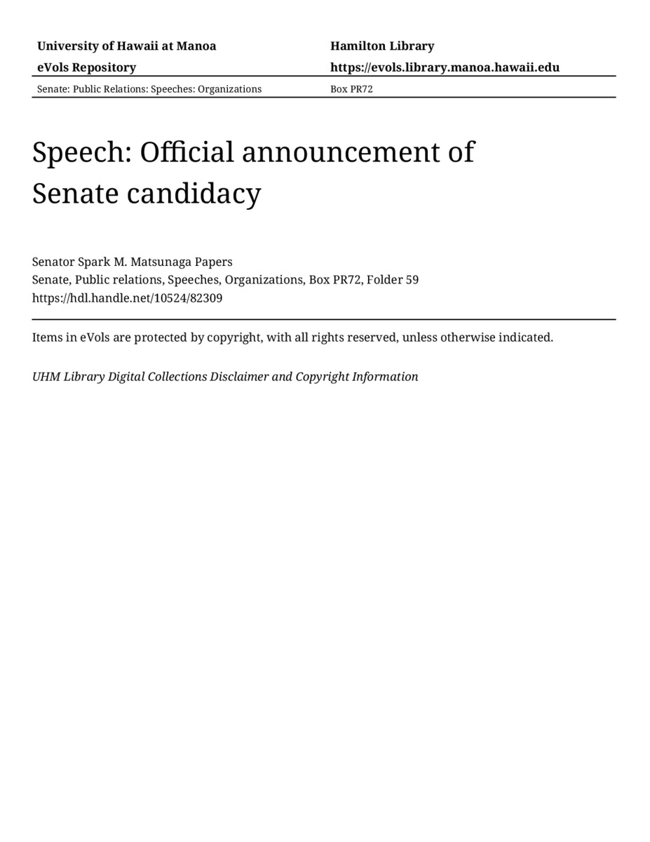 Speech: Official announcement of Senate candidacy, 01/08/76, Senate, Public relations, Speeches, Organizations, Box PR72, Folder 59, Senator Spark M. Matsunaga Papers, Hawaiʻi Congressional Papers Collection, University of Hawaiʻi at Mānoa Library, Honolulu, HI. https://omekas-congress.lib.wvu.edu/catalog/10524_82309 (accessed April 12, 2026).