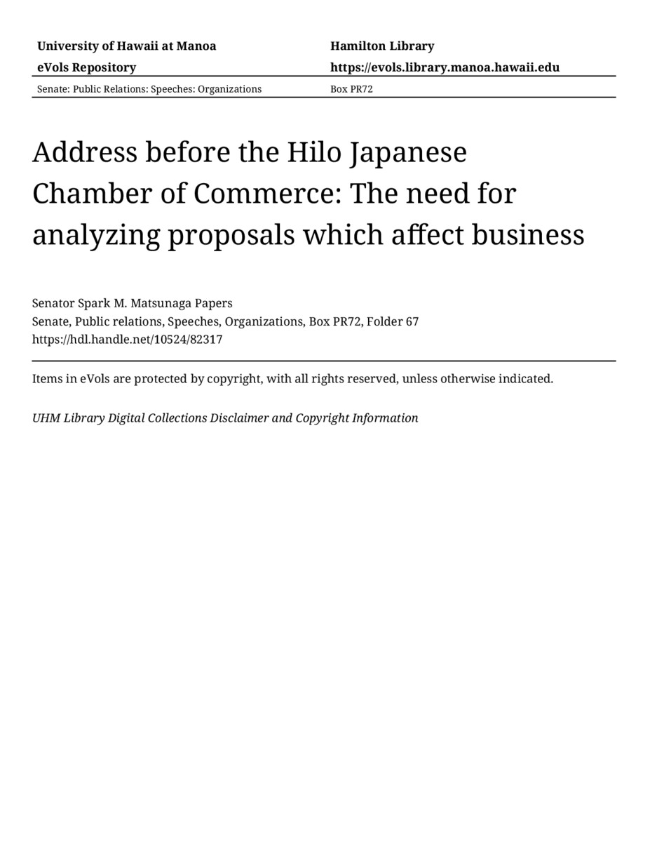 - Address before the Hilo Japanese Chamber of Commerce: The need for analyzing proposals which affect business