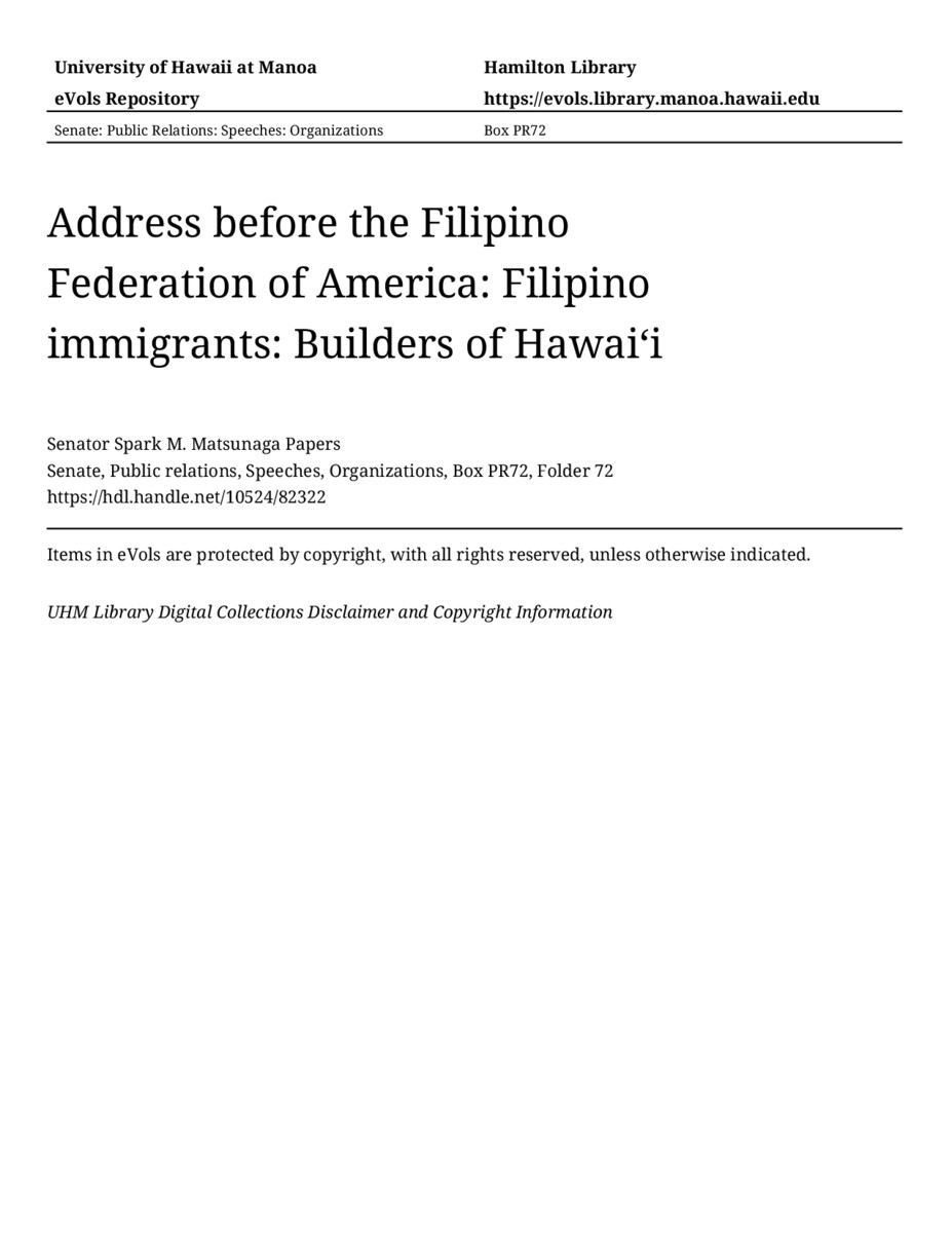 Address before the Filipino Federation of America: Filipino immigrants: Builders of Hawaiʻi