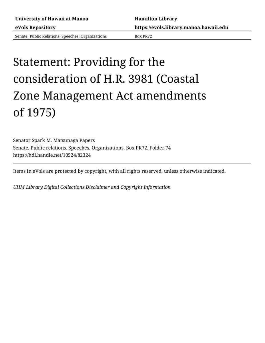 - Statement: Providing for the consideration of H.R. 3981 (Coastal Zone Management Act amendments of 1975)