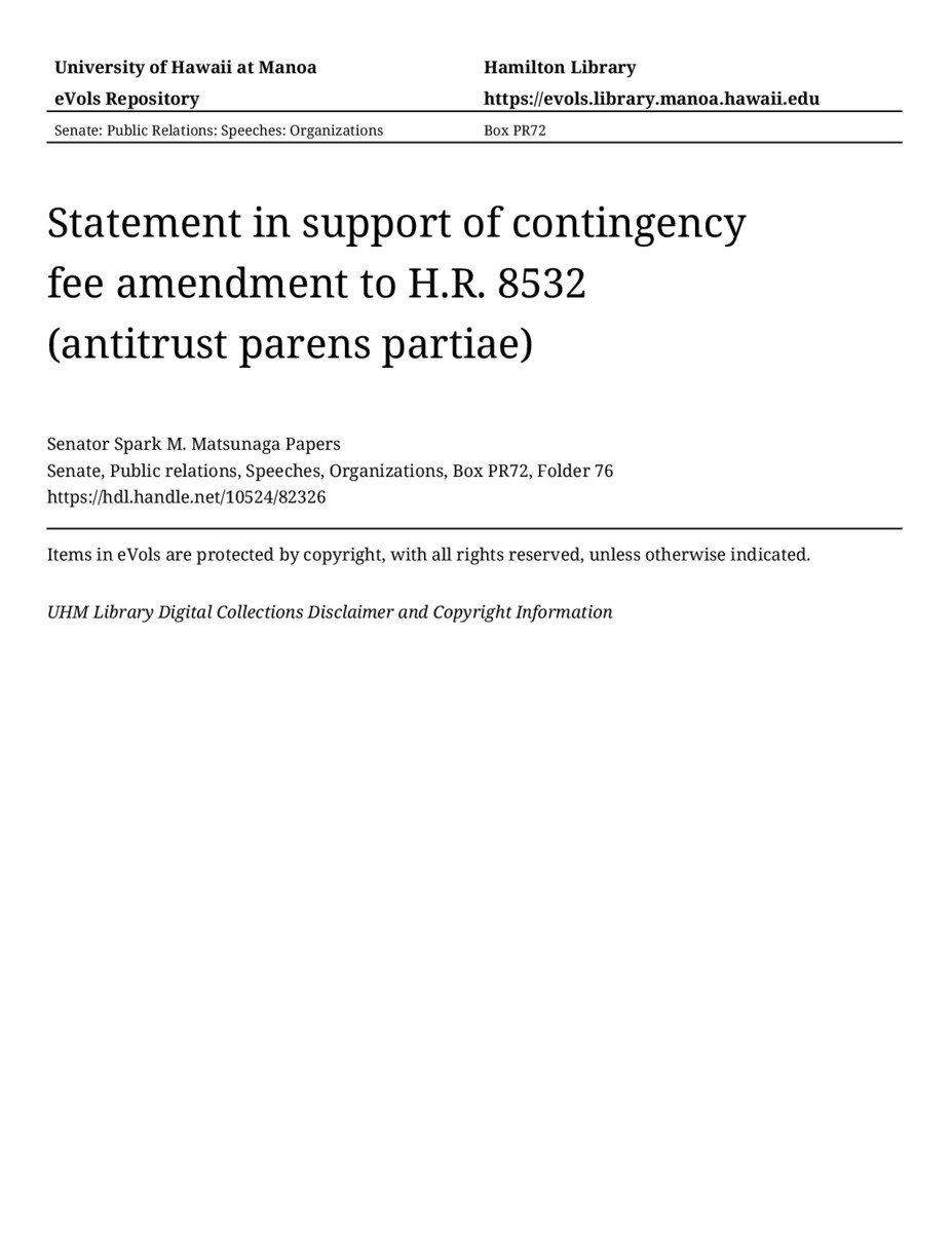 - Statement in support of contingency fee amendment to H.R. 8532 (antitrust parens partiae)