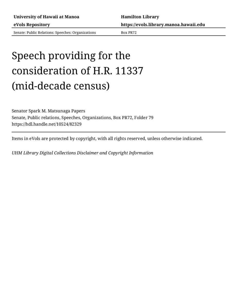 - Speech providing for the consideration of H.R. 11337 (mid-decade census)
