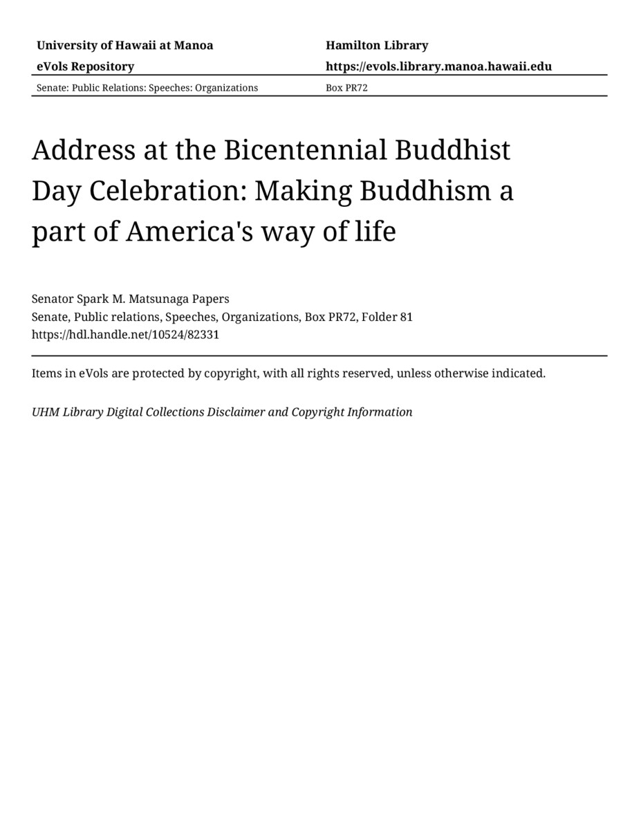 Address at the Bicentennial Buddhist Day Celebration: Making Buddhism a part of America's way of life