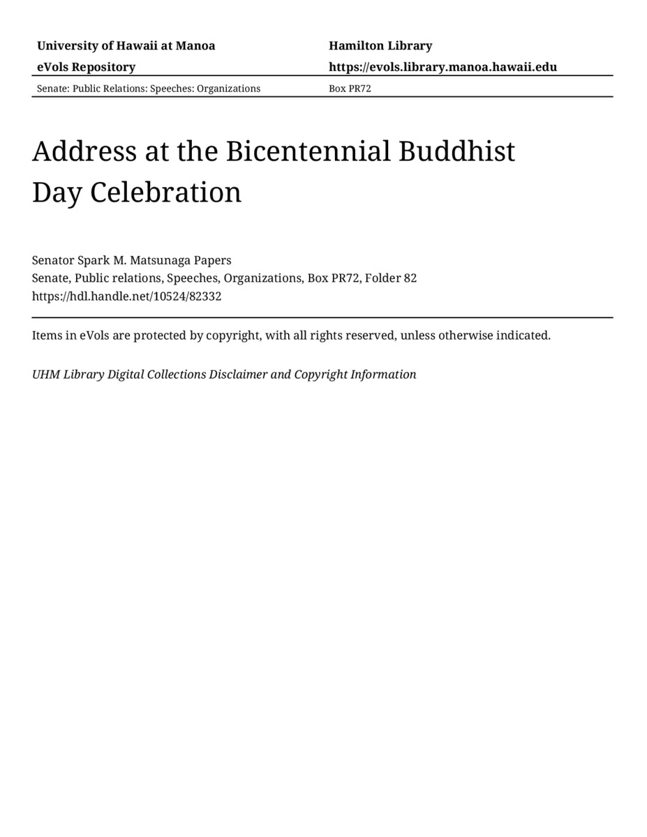 Address at the Bicentennial Buddhist Day Celebration, 04/11/76, Senate, Public relations, Speeches, Organizations, Box PR72, Folder 82, Senator Spark M. Matsunaga Papers, Hawaiʻi Congressional Papers Collection, University of Hawaiʻi at Mānoa Library, Honolulu, HI. https://omekas-congress.lib.wvu.edu/catalog/10524_82332 (accessed April 12, 2026).