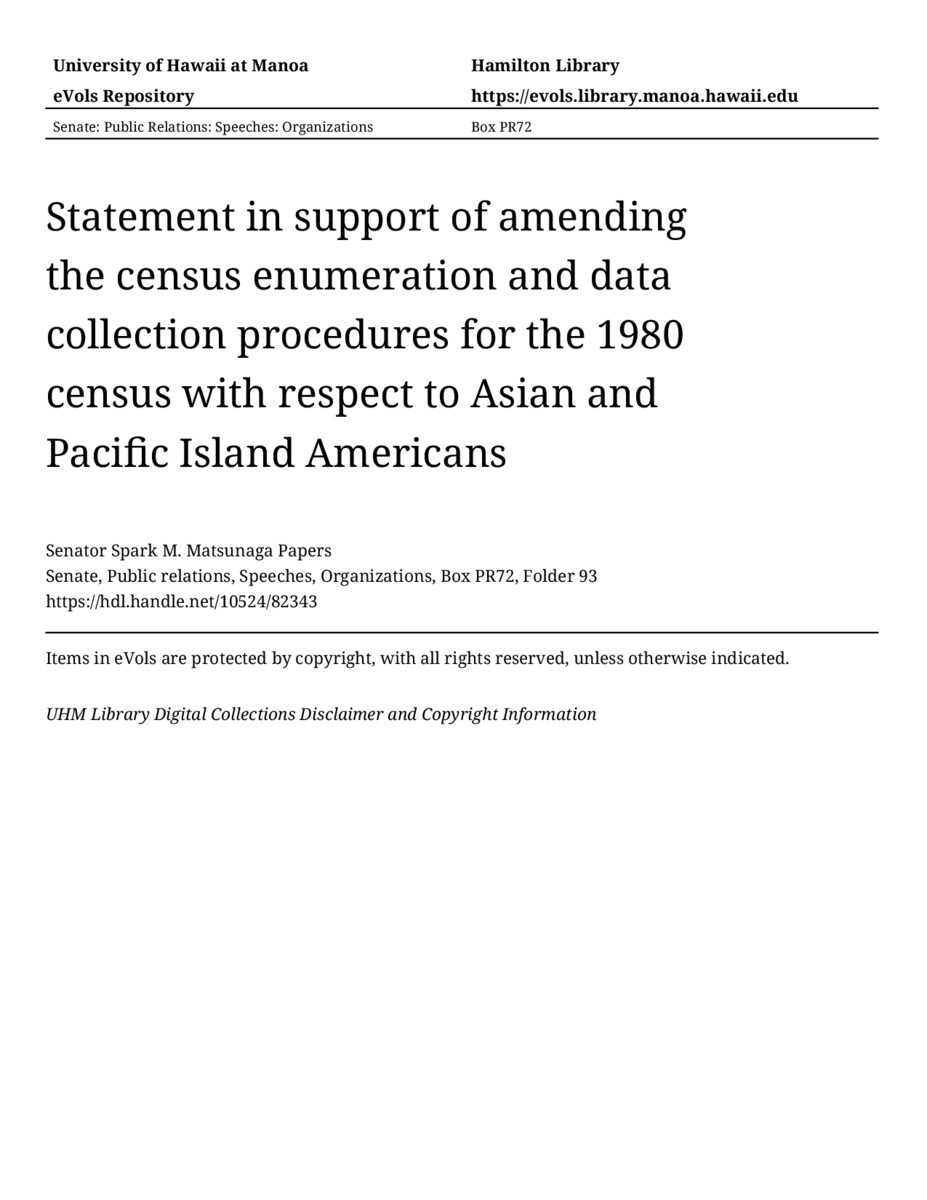 Statement in support of amending the census enumeration and data collection procedures for the 1980 census with respect to Asian and Pacific Island Americans, 06/01/76, Senate, Public relations, Speeches, Organizations, Box PR72, Folder 93, Senator Spark M. Matsunaga Papers, Hawaiʻi Congressional Papers Collection, University of Hawaiʻi at Mānoa Library, Honolulu, HI. https://omekas-congress.lib.wvu.edu/catalog/10524_82343 (accessed April 12, 2026).
