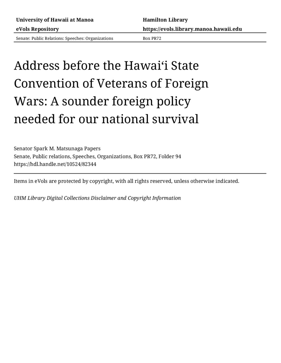 - Address before the Hawaiʻi State Convention of Veterans of Foreign Wars: A sounder foreign policy needed for our national survival